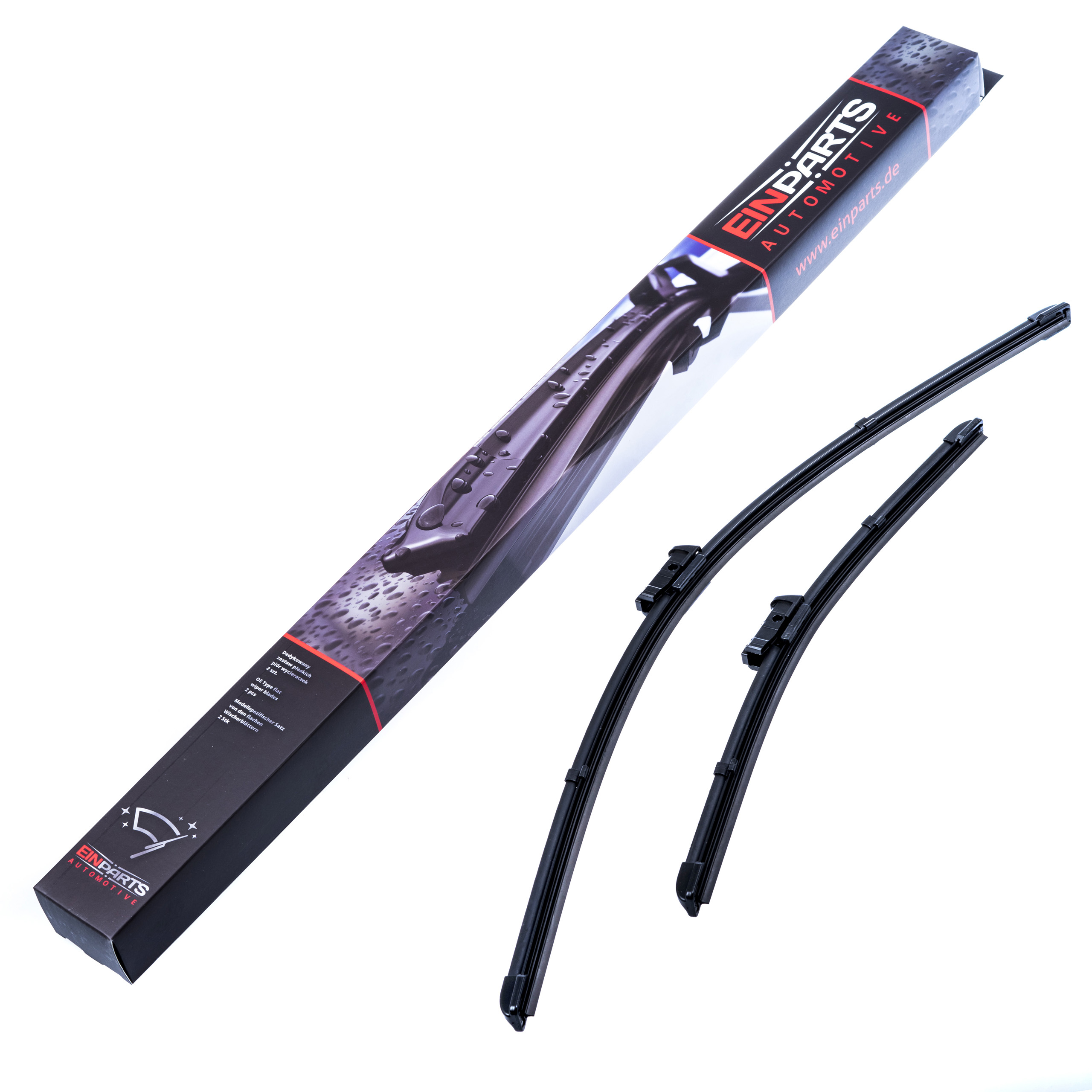 Sada 2 kusů stěračů určených přímo pro konkrétní modely automobilů. Druhy úchytů a délky stírátek jsou totožné s montovanými při sériové výrobě. Souprava je připravena k okamžité instalaci ihned po vyjmutí z krabice.